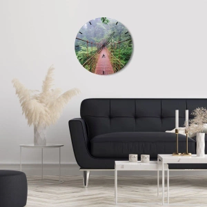 "Suspenso Acima das Coroas" é um relógio de parede que nos transporta para o coração de uma aventura tropical. O tema principal da arte é uma ponte pênsil vermelha, suspensa no alto de uma selva verdejante, com uma leve névoa pairando sobre ela. A composição encanta pela intensidade de suas cores e pelo mistério da paisagem, despertando emoções e inspirando a descoberta de novos lugares.