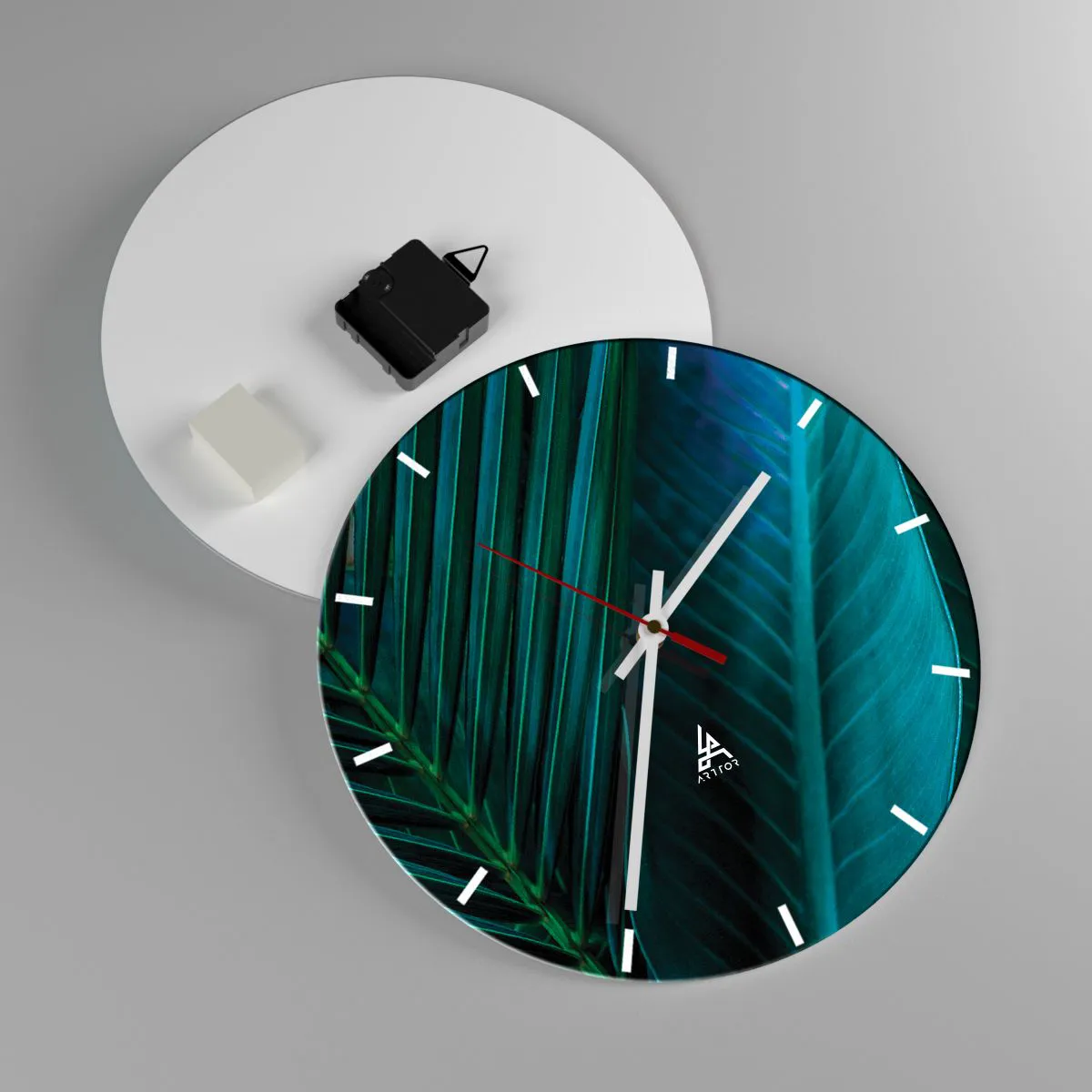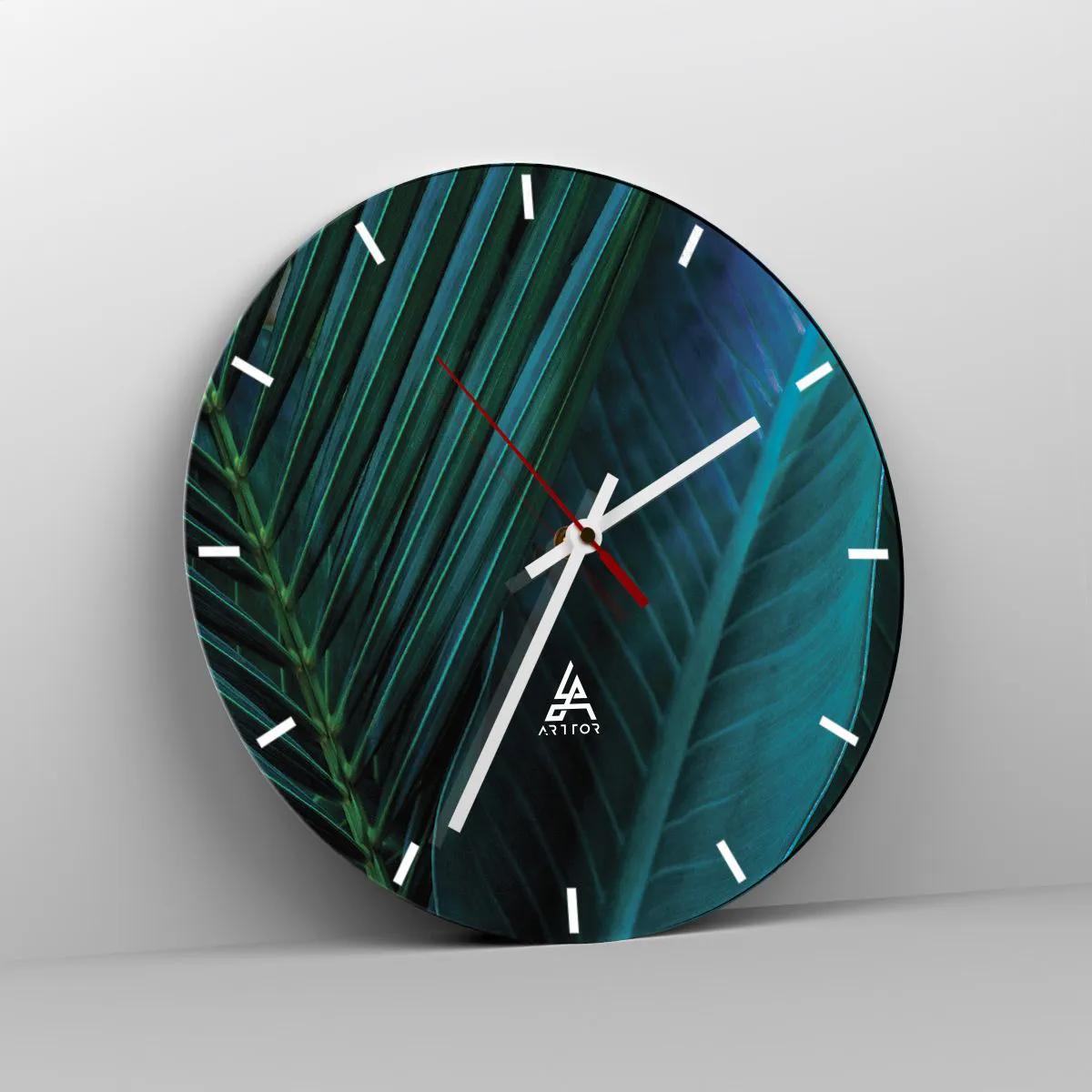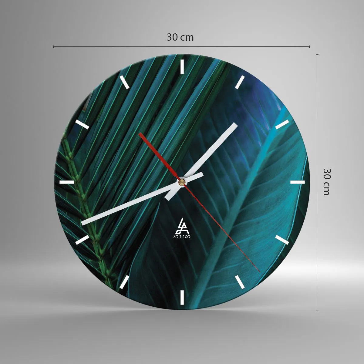 Relógio de parede - Relógio em vidro - Um close de folhas tropicais em tons de verde e turquesa. - 30x30cm - Anatomia da vegetação - Decoração de parede moderna para a sala de estar, cozinha e quarto ARTTOR