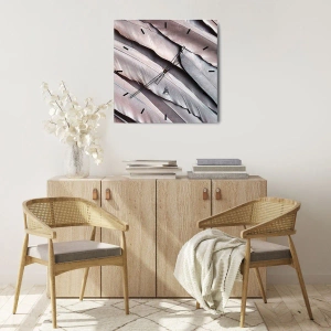 - Esta representação artística de penas em tons de rosa e cinza cativa pela sua delicadeza e sutileza. Um tema perfeito para espaços modernos e minimalistas, repletos de luz e elegância.