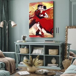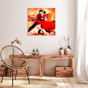 - Uma pintura que retrata um casal dançando tango em tons vermelhos sobre um fundo dinâmico. Uma composição artística e apaixonante que traz movimento e emoção ao interior.
