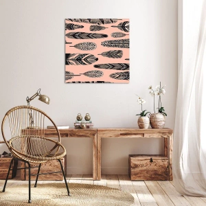 A impressão em tela "Penas decorativas em fundo claro" é uma decoração de parede sutil e elegante que chama a atenção com seu padrão único. Ela retrata penas pretas e brancas dispostas sobre um fundo rosa pastel, criando uma composição harmoniosa e elegante. Cada pena se destaca com seu padrão geométrico único, conferindo à imagem um caráter artístico e singular.