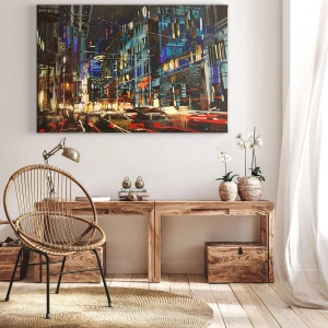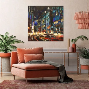 Os tons dominantes de azul, vermelho e amarelo na pintura enfatizam a vibração da paisagem urbana. Detalhes arquitetônicos, faróis de carros e reflexos na superfície molhada criam a ilusão de movimento, adicionando realismo e profundidade a toda a composição. É a decoração perfeita para quem aprecia design moderno e motivos artísticos inspiradores.