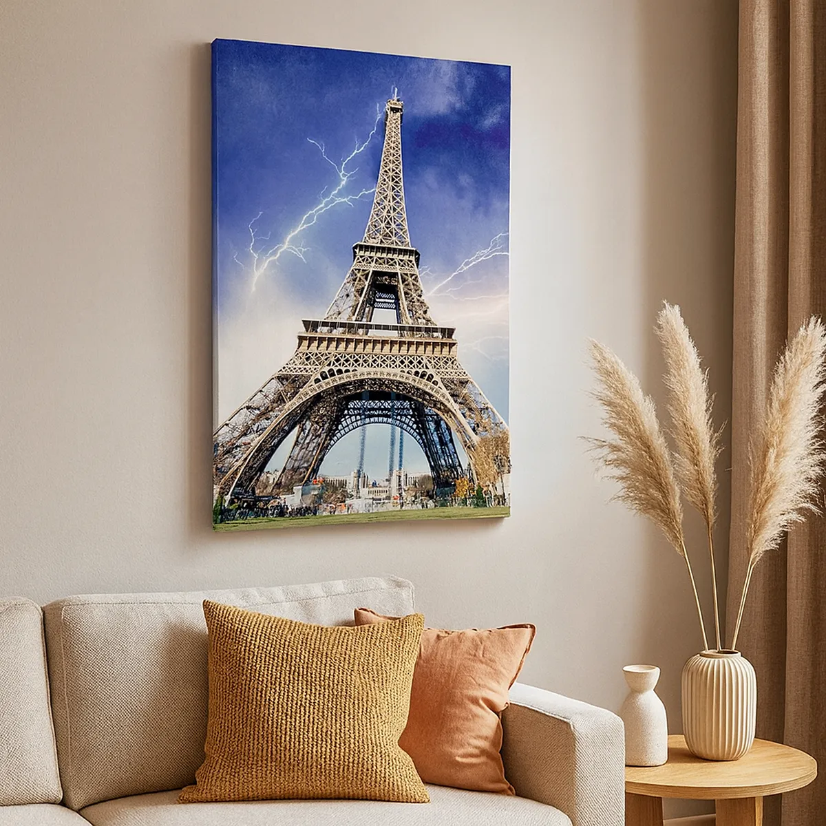 A tela é esticada na moldura. Os lados e bordas são impressos para criar uma continuação da imagem. O quadro está pronto para ser pendurado na parede. Cada produto tem um gancho ligado à moldura e um conjunto de montagem (parafuso + cavilha).