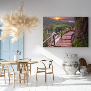 A tela é esticada na moldura. Os lados e bordas são impressos para criar uma continuação da imagem. O quadro está pronto para ser pendurado na parede. Cada produto tem um gancho ligado à moldura e um conjunto de montagem (parafuso + cavilha).