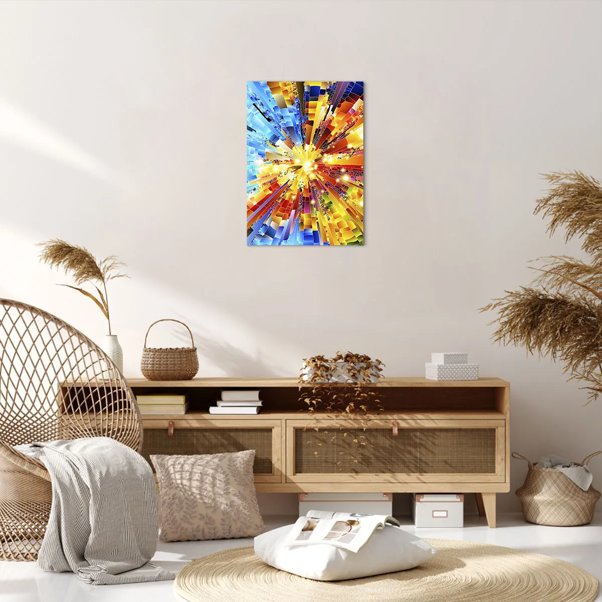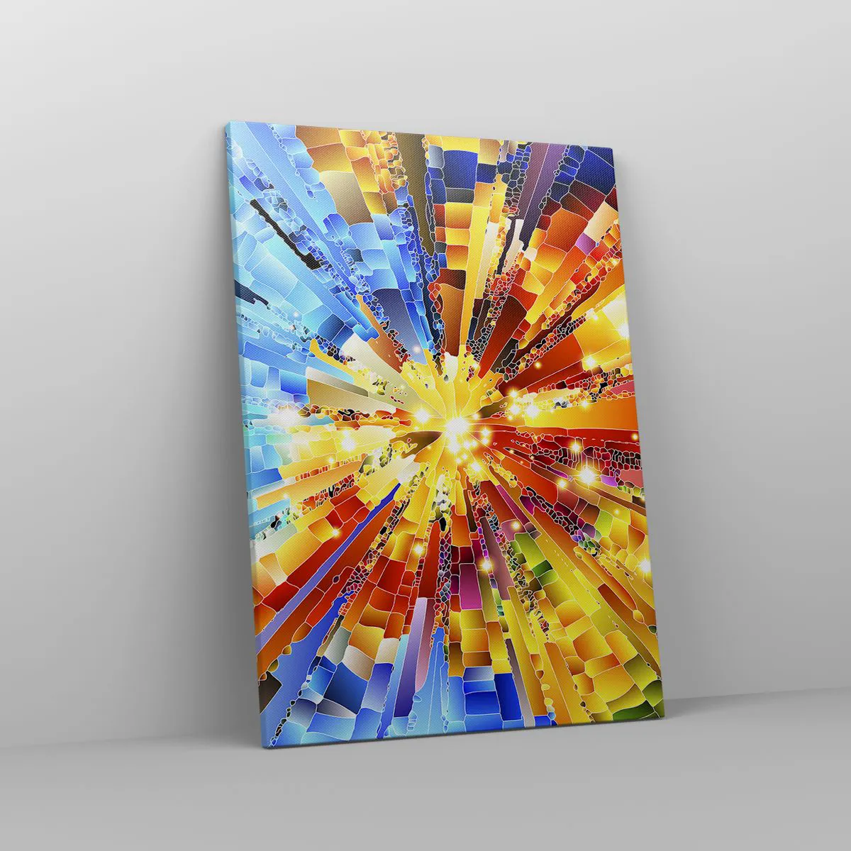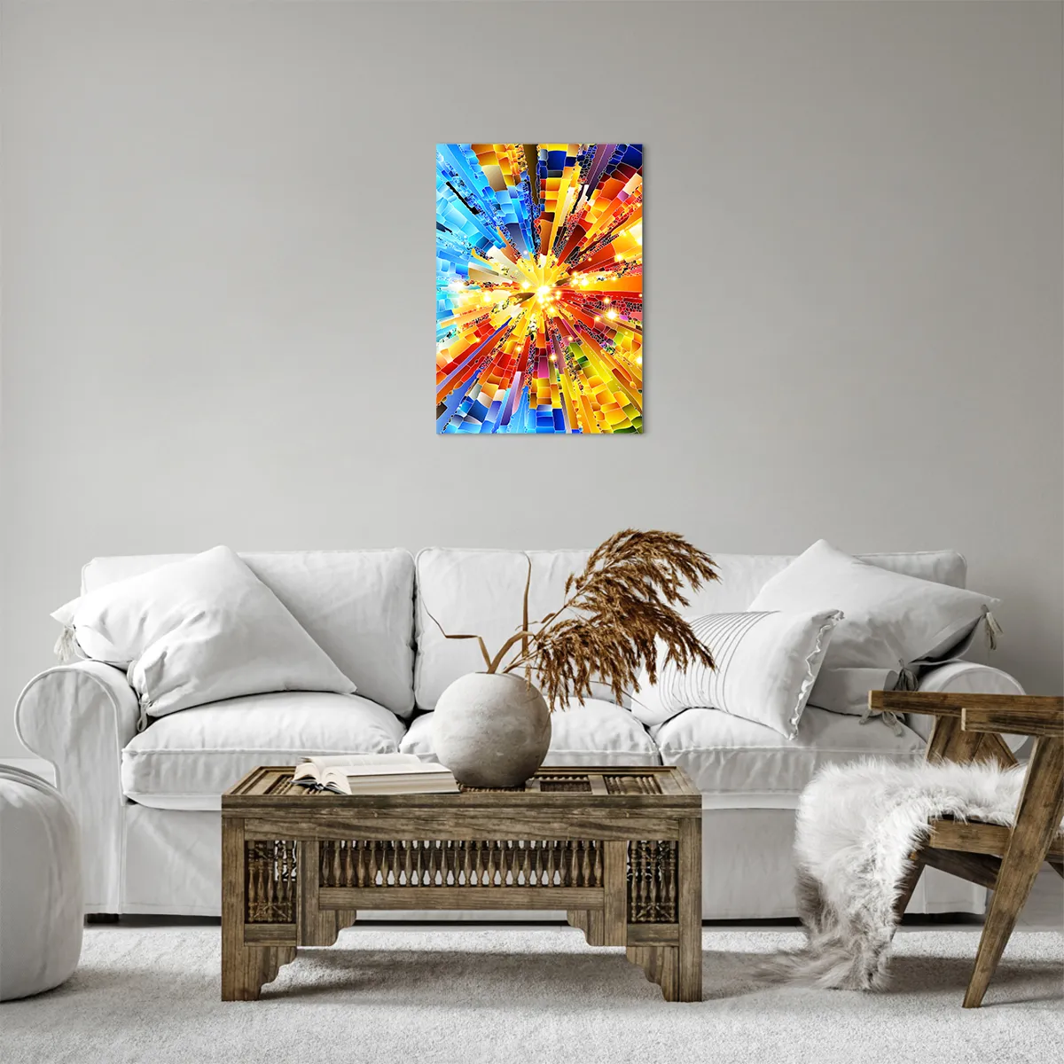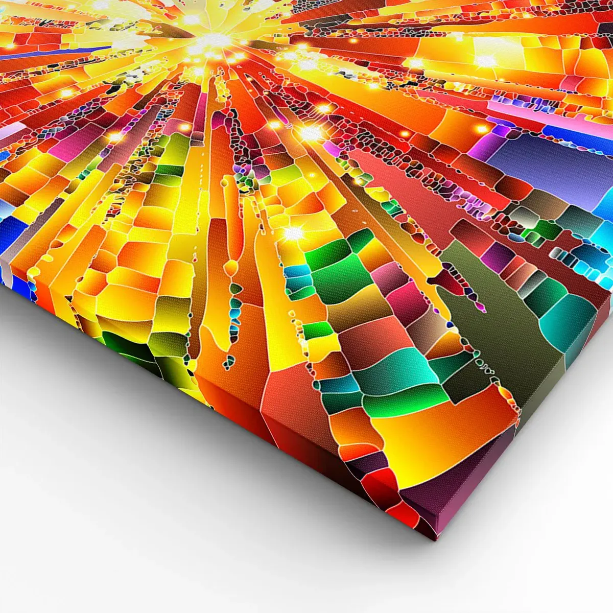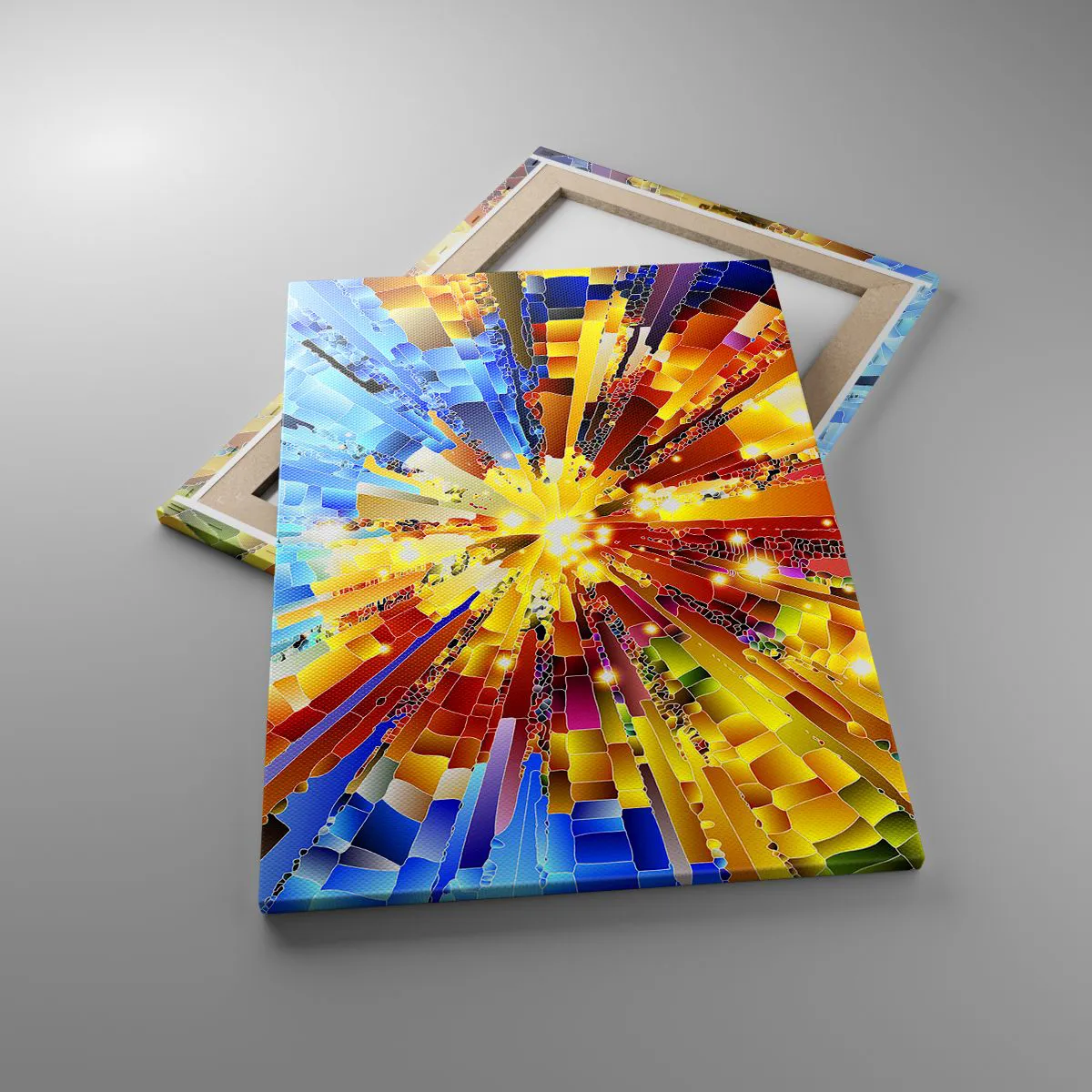 A tela é esticada na moldura. Os lados e bordas são impressos para criar uma continuação da imagem. O quadro está pronto para ser pendurado na parede. Cada produto tem um gancho ligado à moldura e um conjunto de montagem (parafuso + cavilha).