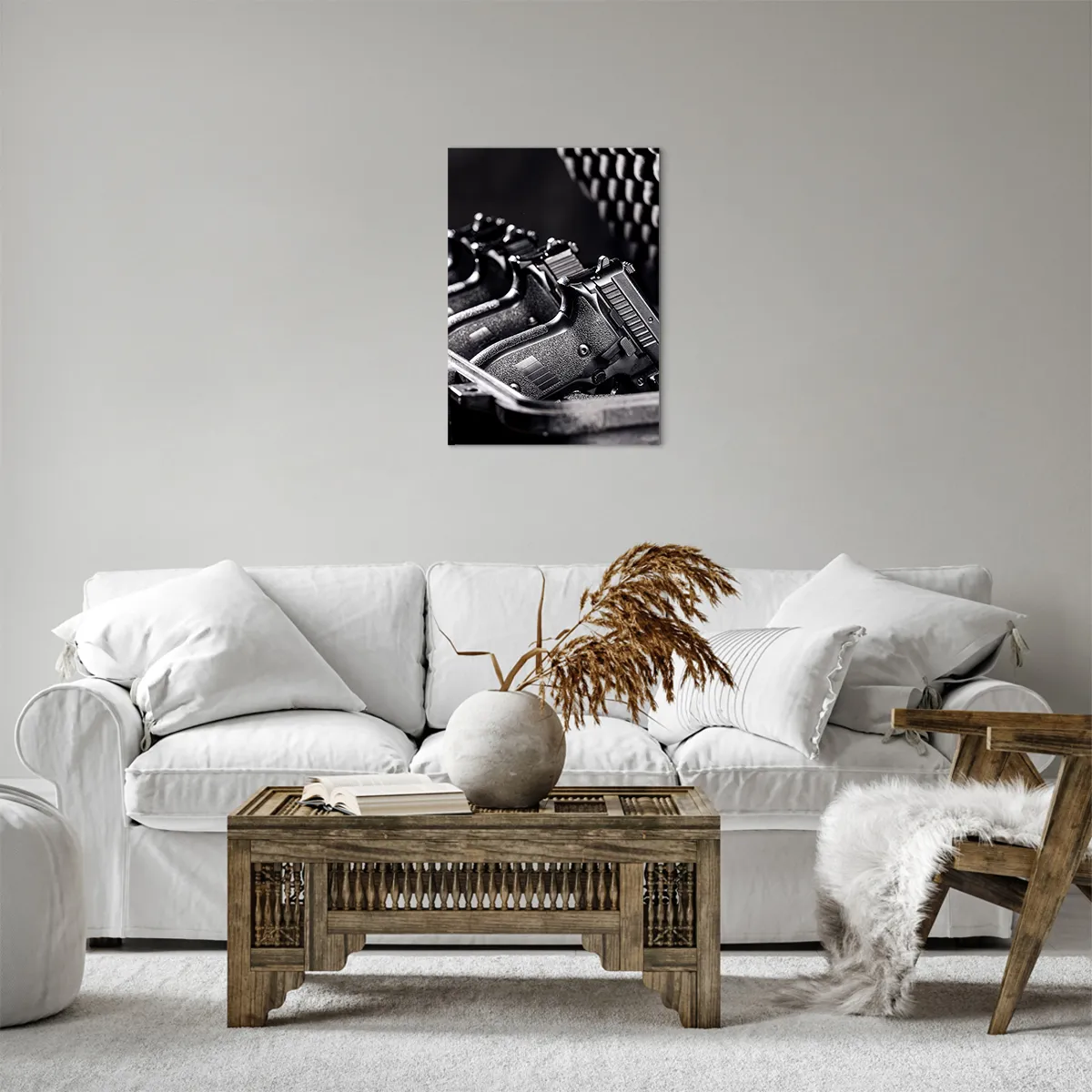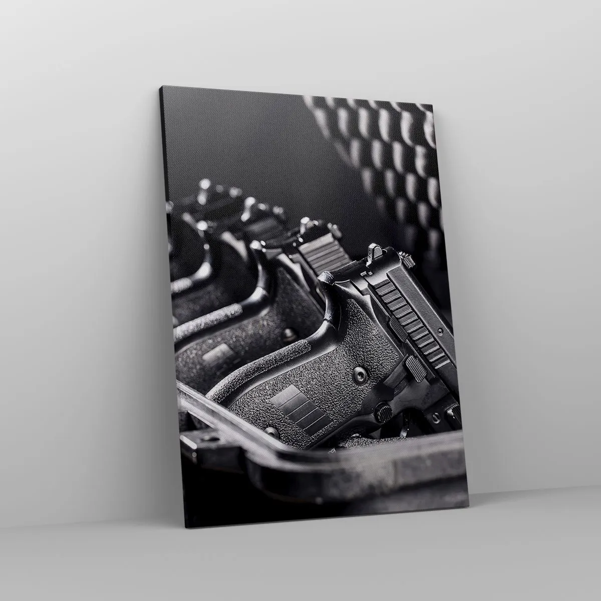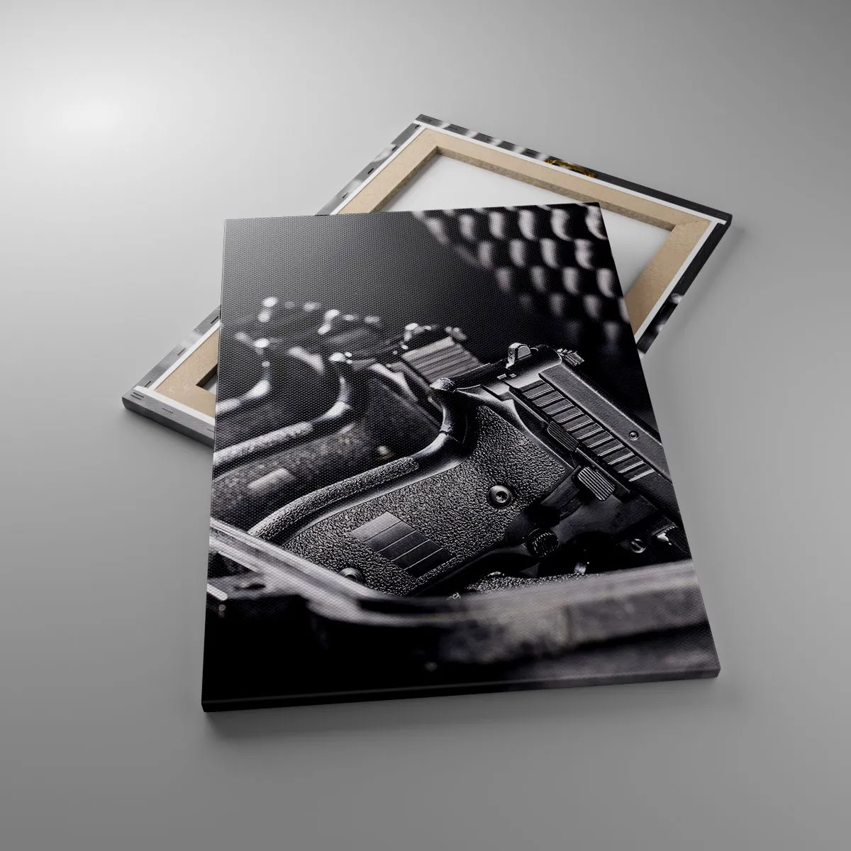 A tela é esticada na moldura. Os lados e bordas são impressos para criar uma continuação da imagem. O quadro está pronto para ser pendurado na parede. Cada produto tem um gancho ligado à moldura e um conjunto de montagem (parafuso + cavilha).