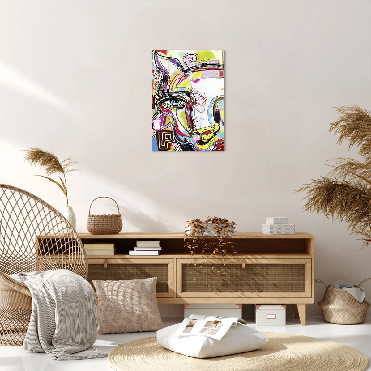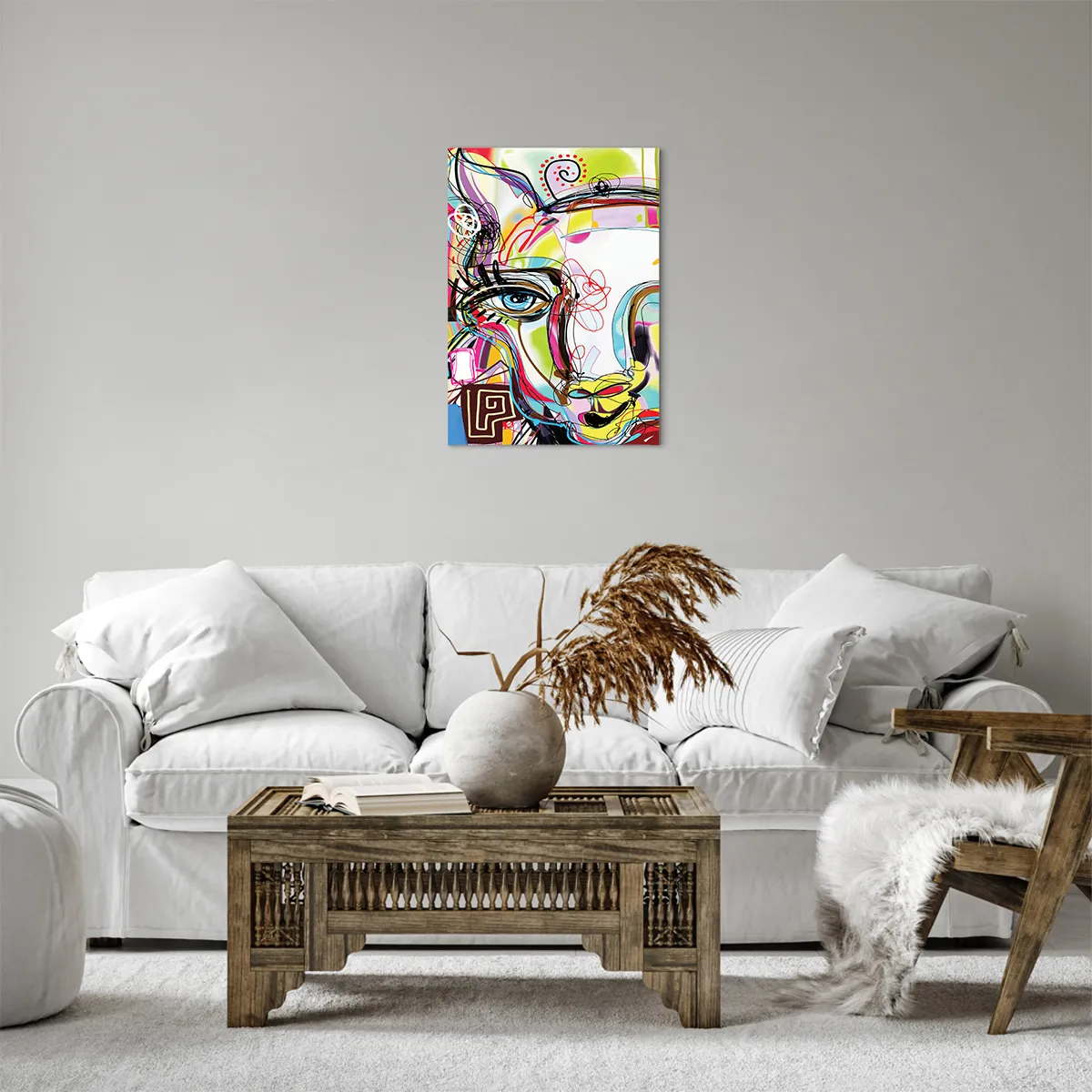 A tela é esticada na moldura. Os lados e bordas são impressos para criar uma continuação da imagem. O quadro está pronto para ser pendurado na parede. Cada produto tem um gancho ligado à moldura e um conjunto de montagem (parafuso + cavilha).