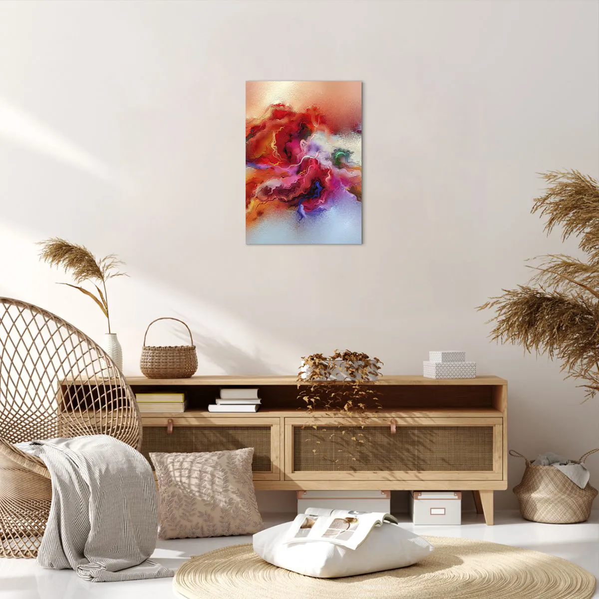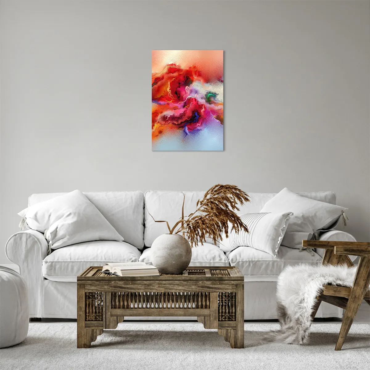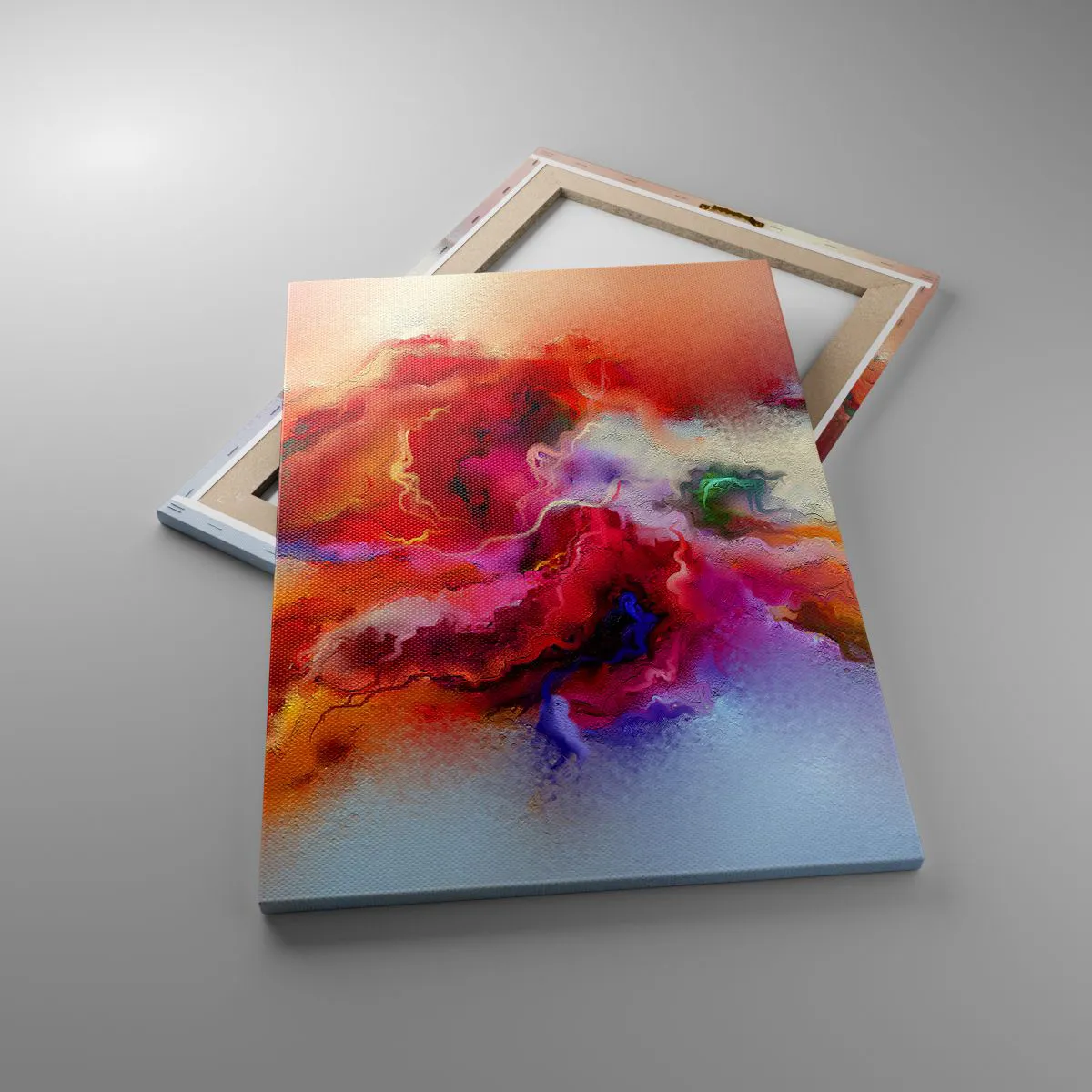 A tela é esticada na moldura. Os lados e bordas são impressos para criar uma continuação da imagem. O quadro está pronto para ser pendurado na parede. Cada produto tem um gancho ligado à moldura e um conjunto de montagem (parafuso + cavilha).