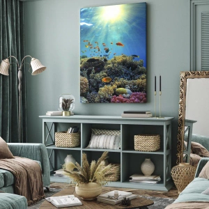 - A pintura retrata um recife de coral repleto de peixes coloridos, iluminado pelos raios de sol debaixo d'água. Perfeito para interiores inspirados na natureza, cria uma atmosfera tranquila e exótica.