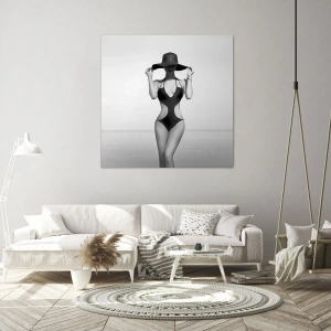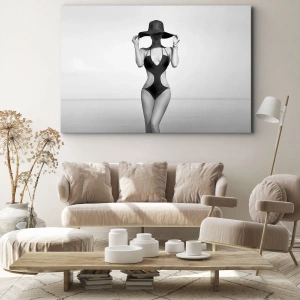 A pintura apresentada "Silhueta em preto e branco de uma mulher de chapéu" é uma decoração única que combina estilo e elegância. Contra o fundo de um mar calmo, a silhueta de uma mulher em um maiô preto e um chapéu largo é visível, adicionando sofisticação e mistério. Linhas sutis e a harmonia da composição tornam a obra atraente e trazem paz a qualquer interior.