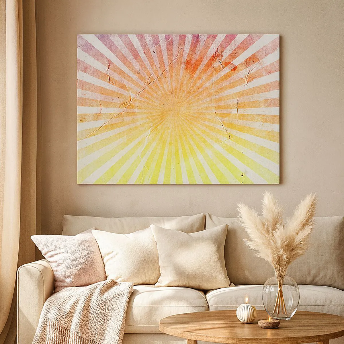 Pinturas com motivos de raios de sol, como esta, simbolizam energia, otimismo e novos começos. Seu caráter universal e a capacidade de trazer brilho e harmonia as tornam apreciadas tanto em interiores modernos quanto clássicos. As cores laranja e amarelo evocam alegria, aconchego e criatividade, enfatizando o caráter único da imagem.