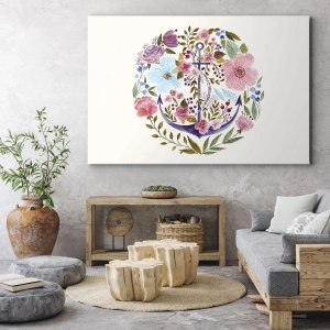 Arte de parede - O Bom Sonho de um Marinheiro - Âncora cercada por flores em estilo aquarela sobre fundo claro