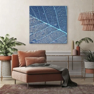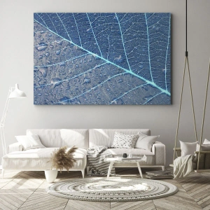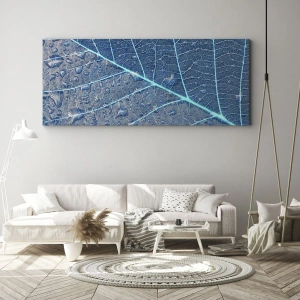 - Esta pintura retrata um detalhe de folha em tons de azul, coberto por gotas de água. Uma decoração sutil e elegante que traz harmonia e beleza natural a qualquer interior.