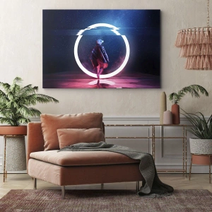 Quadro em tela - Um personagem em um ambiente futurista com um círculo de neon - 70x50cm - Entre Mundos - Decoração de parede moderna para a sala de estar e quarto ARTTOR