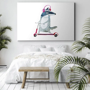 - Uma pintura representando um texugo em uma scooter usando fones de ouvido rosa. Uma decoração divertida que traz humor e alegria a qualquer ambiente.