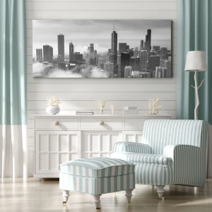 Arte de parede - Paisagem Americana - Panorama da cidade com arranha-céus nas nuvens em preto e branco