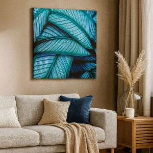 A impressão em tela "Linhas da Vida" é uma decoração única que combina a beleza da natureza com o design moderno. Ela retrata um close-up de folhas em tons de turquesa, destacando sua textura e detalhes delicados. A composição encanta com sua harmonia e expressividade.
