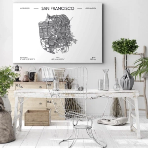 "Anatomia de São Francisco" é um mapa estilizado da cidade de São Francisco, criado em estilo minimalista em preto e branco. Esta interpretação artística do plano da cidade encanta com detalhes urbanos precisos que lhe conferem elegância e modernidade. Graças ao seu caráter geométrico e contrastes sutis, a pintura traz harmonia e ordem ao interior.