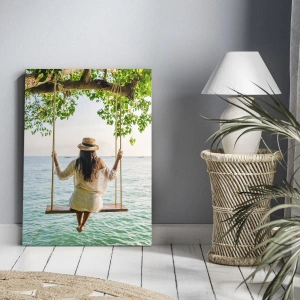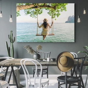 Quadro em tela - Mulher em um balanço à beira-mar em uma paisagem tropical - 70x50cm - A vida é bela - Decoração de parede moderna para a sala de estar e quarto ARTTOR