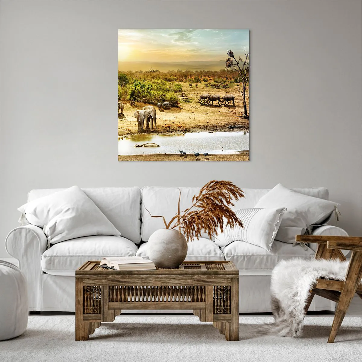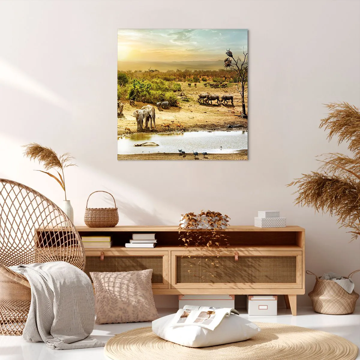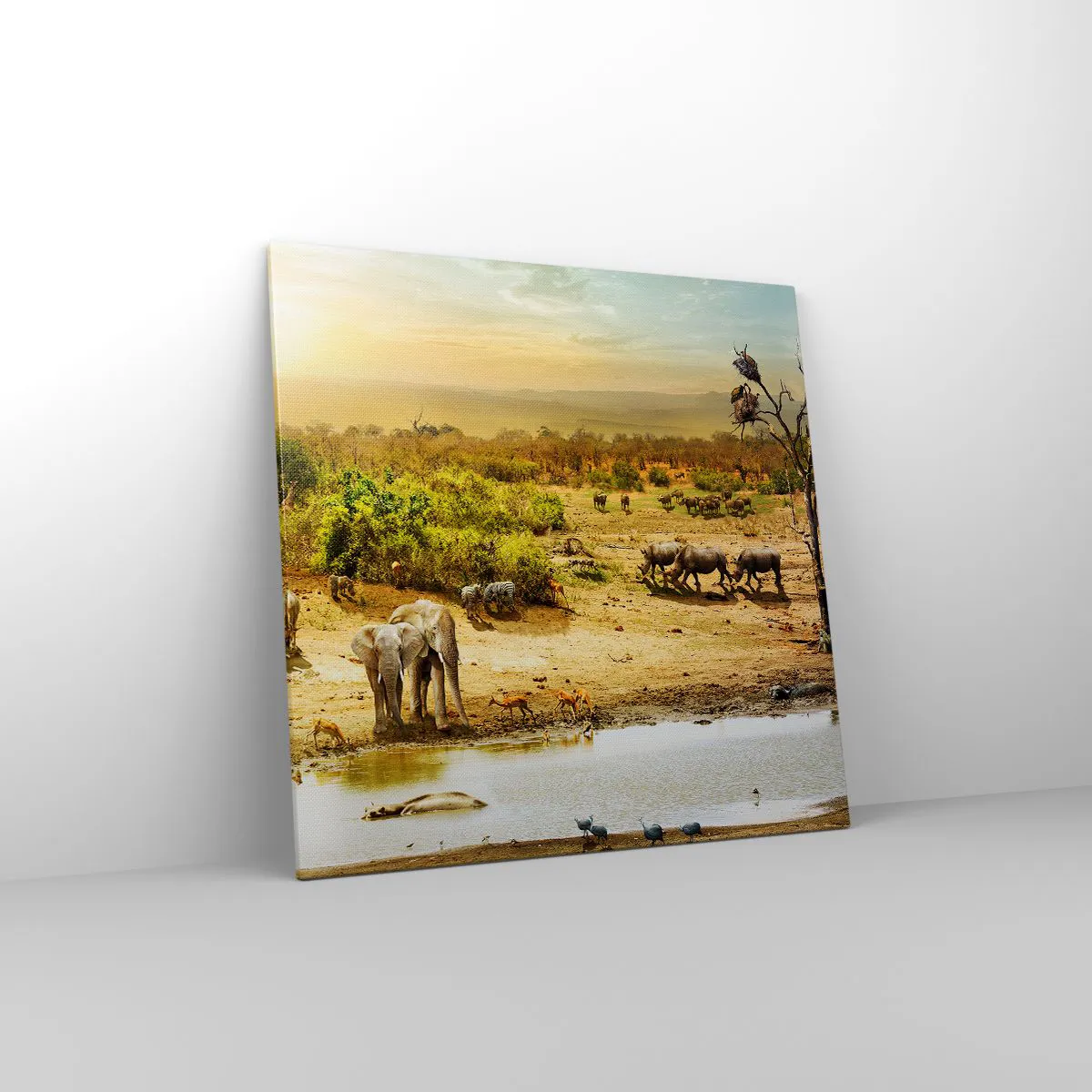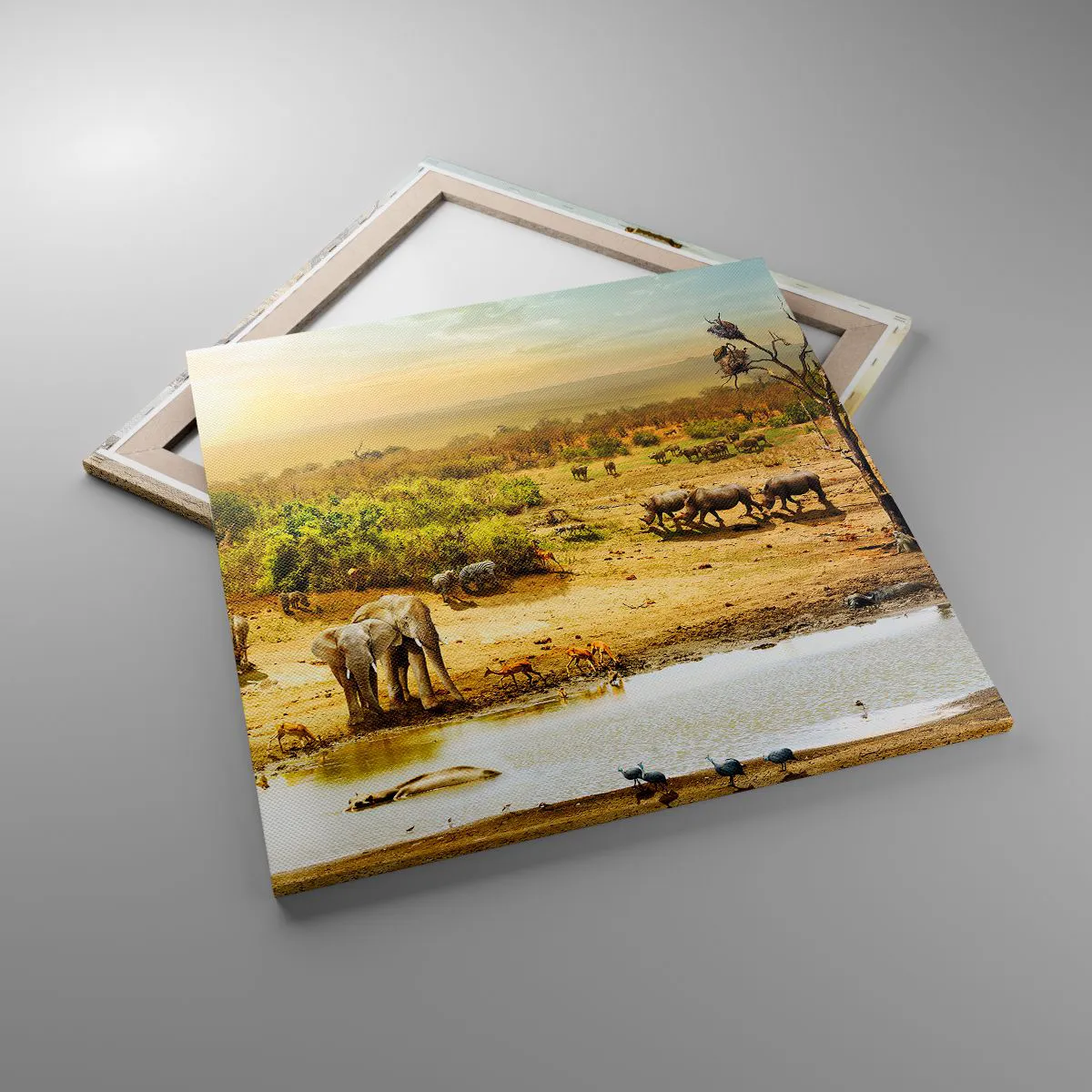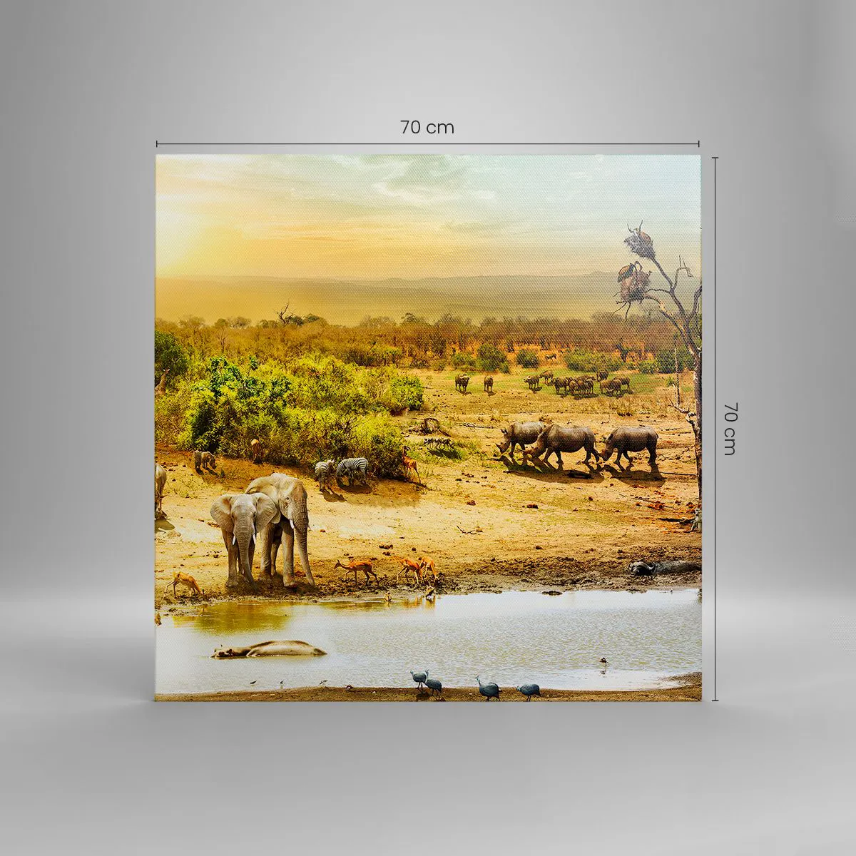 A tela é esticada na moldura. Os lados e bordas são impressos para criar uma continuação da imagem. O quadro está pronto para ser pendurado na parede. Cada produto tem um gancho ligado à moldura e um conjunto de montagem (parafuso + cavilha).