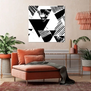 - A pintura apresenta padrões geométricos em forma de triângulos e linhas pretas e brancas, criando um efeito visual moderno e minimalista. Perfeito para interiores com design simples e elegante.