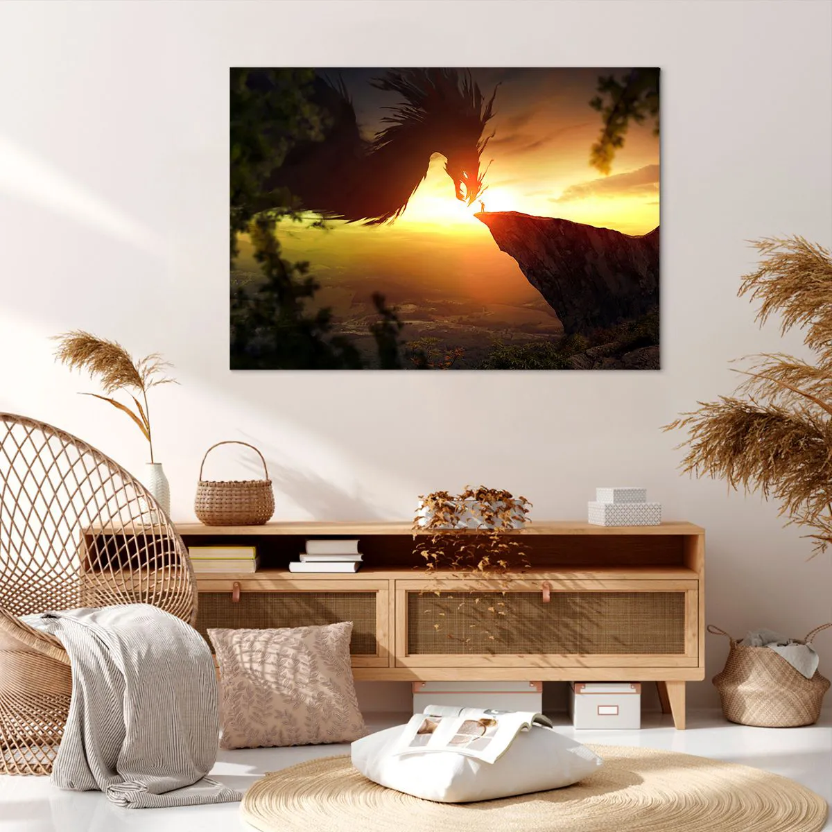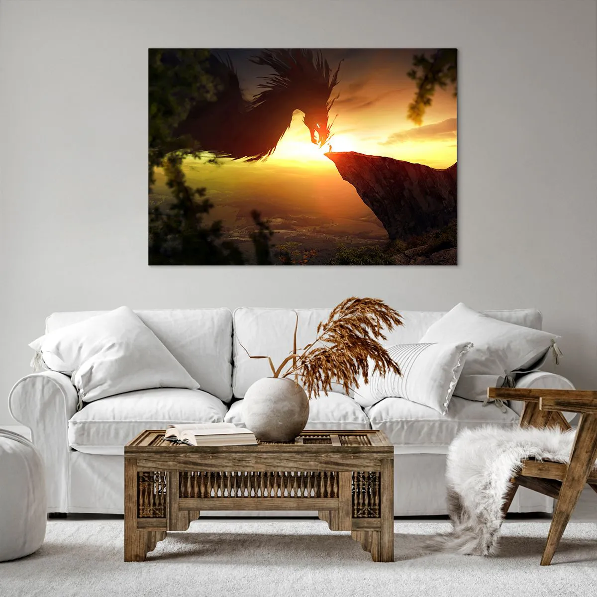 A tela é esticada na moldura. Os lados e bordas são impressos para criar uma continuação da imagem. O quadro está pronto para ser pendurado na parede. Cada produto tem um gancho ligado à moldura e um conjunto de montagem (parafuso + cavilha).