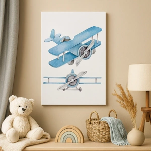 A impressão em tela "Nascido para Vencer" é uma decoração única que retrata aviões azuis em estilo retrô. Suas cores sutis e design minimalista a tornam um complemento perfeito para quartos infantis e espaços modernos.