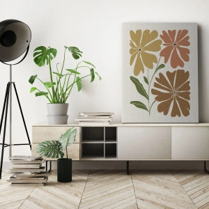 A impressão em tela Natureza e Geometria é uma composição sutil e elegante que combina a beleza da natureza com um estilo minimalista. O motivo central são três flores em cores quentes – amarelo, laranja e marrom – apresentadas sobre um fundo claro e neutro. A simplicidade da forma e a harmonia das cores fazem desta pintura uma adição única a interiores modernos e clássicos.