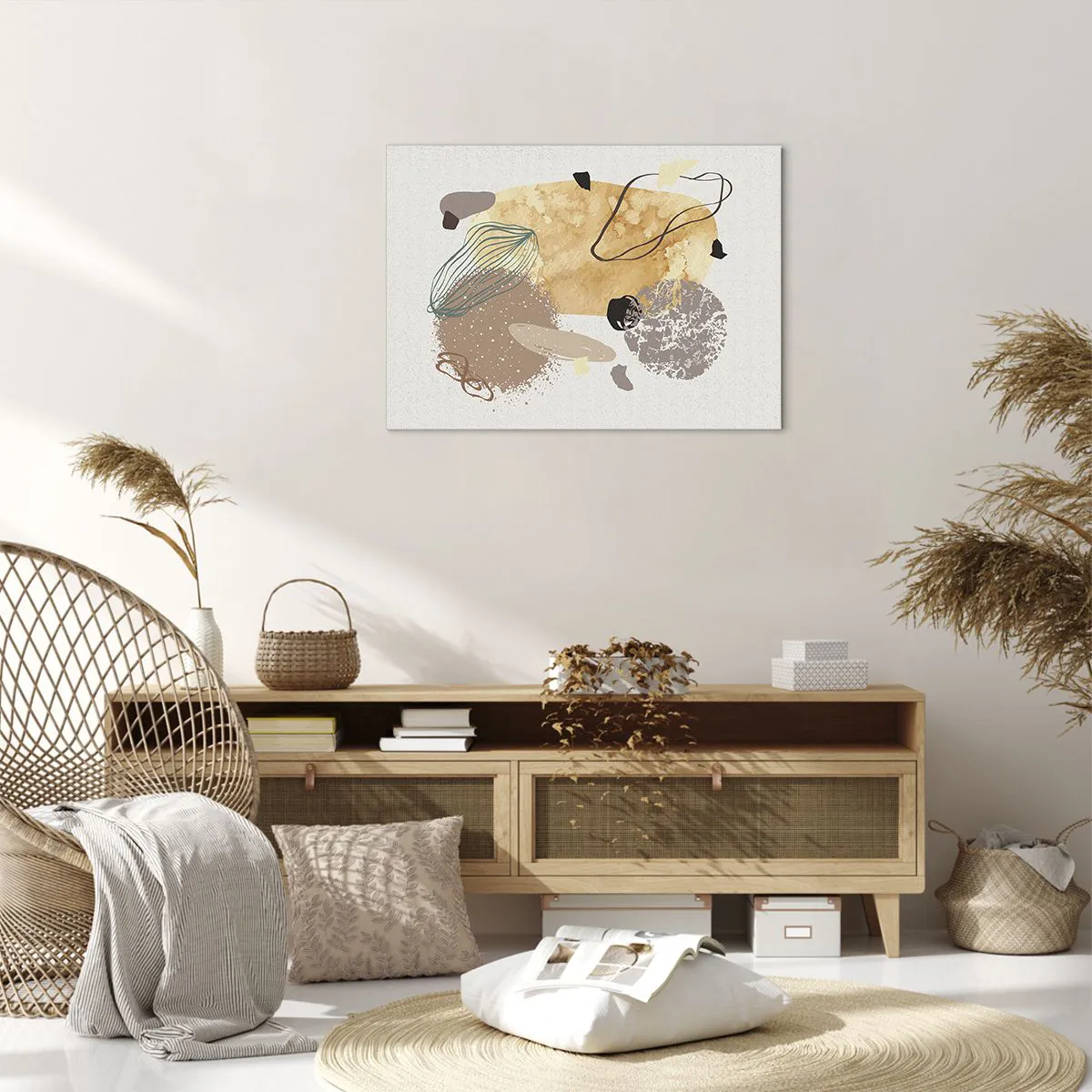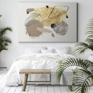 - Esta pintura retrata uma composição de formas abstratas em tons de bege e amarelo. Uma decoração minimalista e sutil que traz harmonia e elegância a qualquer interior.