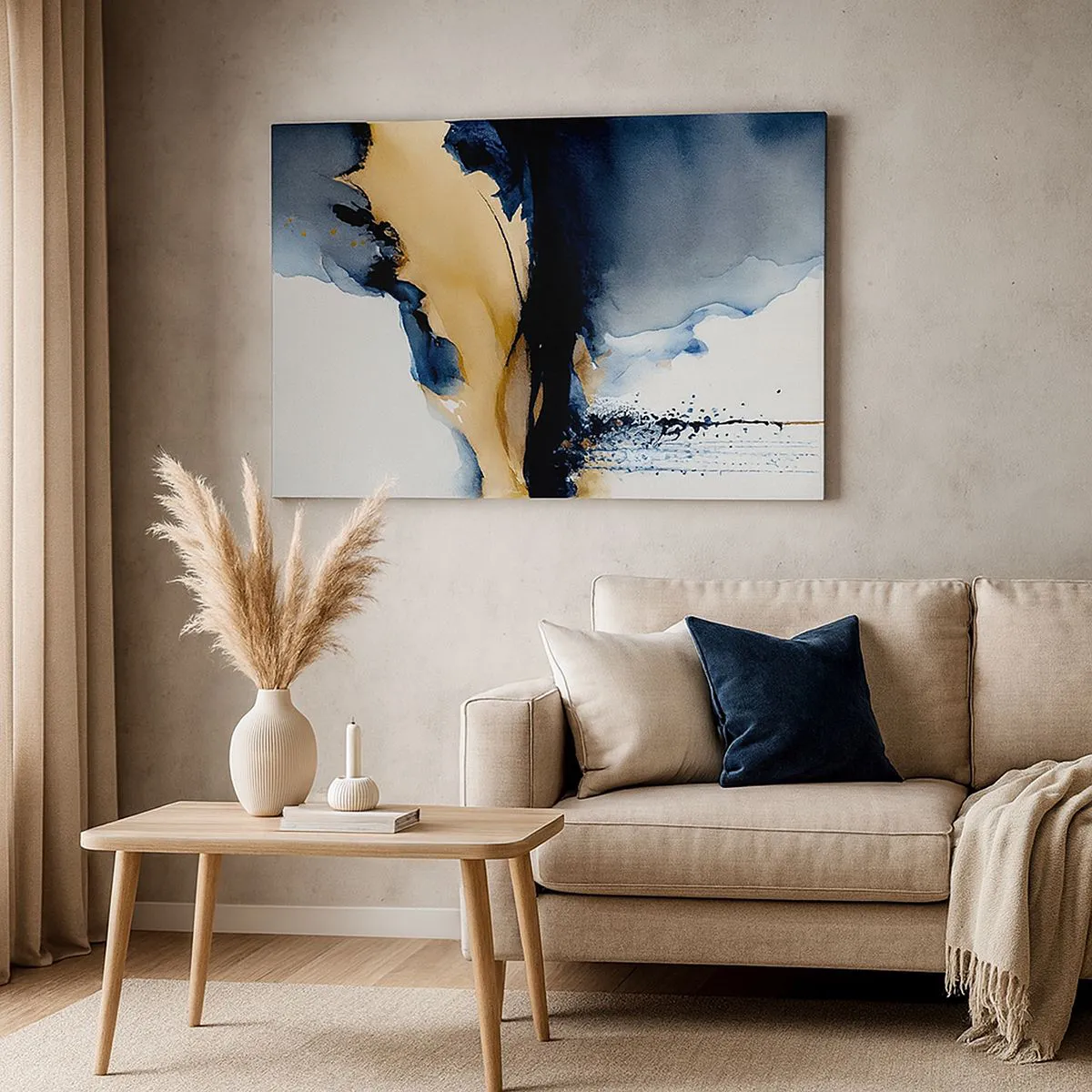 - Esta impressão em tela retrata uma composição abstrata em tons de azul-marinho e dourado. Perfeita para interiores elegantes e modernos, ela traz harmonia e um toque artístico sutil.