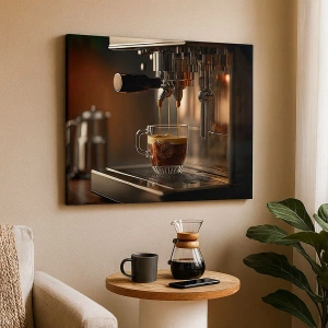 - Esta impressão em tela de 70x50 cm retrata uma máquina de café expresso moderna com uma xícara de expresso fresco. É a peça decorativa perfeita para amantes de café e interiores elegantes.