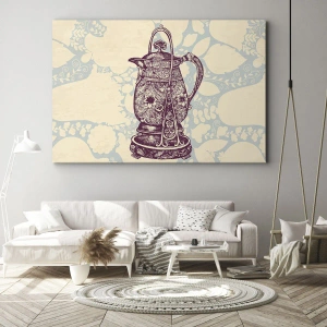 - Esta impressão em tela de 70x50 cm retrata um jarro estilizado com rica ornamentação sobre um fundo floral. Suas cores suaves e design clássico o tornam um complemento perfeito para interiores elegantes.