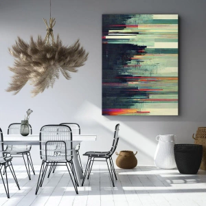 - Esta impressão em tela de 70x50 cm retrata um panorama urbano abstrato com linhas verticais. Perfeita para interiores modernos e minimalistas.