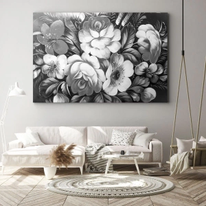 Quadro em tela - Flores pretas e brancas em uma composição clássica e elegante - 70x50cm - A beleza em cinza - Decoração de parede moderna para a sala de estar e quarto ARTTOR