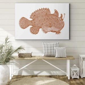 - Esta impressão em tela de 70x50 cm retrata um peixe detalhado na cor cobre sobre um fundo branco. Perfeita para interiores modernos, ela adiciona sutileza e elegância.
