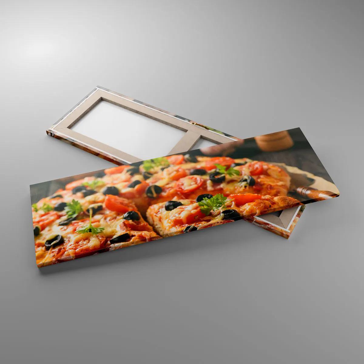 A tela é esticada na moldura. Os lados e bordas são impressos para criar uma continuação da imagem. O quadro está pronto para ser pendurado na parede. Cada produto tem um gancho ligado à moldura e um conjunto de montagem (parafuso + cavilha).