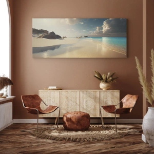 Quadro em tela - Uma praia ensolarada com mar azul e rochas - 70x50cm - Um dia de sonho - Decoração de parede moderna para a sala de estar e quarto ARTTOR