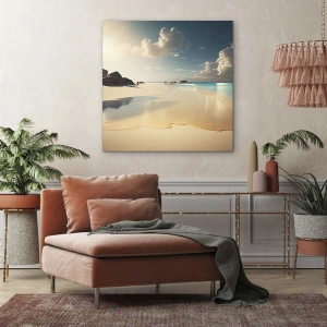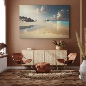 A impressão em tela "Dia dos Sonhos" retrata uma vista pitoresca de uma praia ensolarada, onde as águas azuis do mar envolvem a areia fina e as rochas encantadoras adicionam um caráter único à paisagem. Esta composição encanta com sua harmonia de cores e luz, que trazem uma atmosfera de relaxamento e paz de verão para o interior.