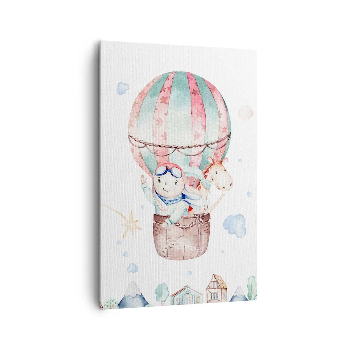 A tela é esticada na moldura. Os lados e bordas são impressos para criar uma continuação da imagem. O quadro está pronto para ser pendurado na parede. Cada produto tem um gancho ligado à moldura e um conjunto de montagem (parafuso + cavilha).
