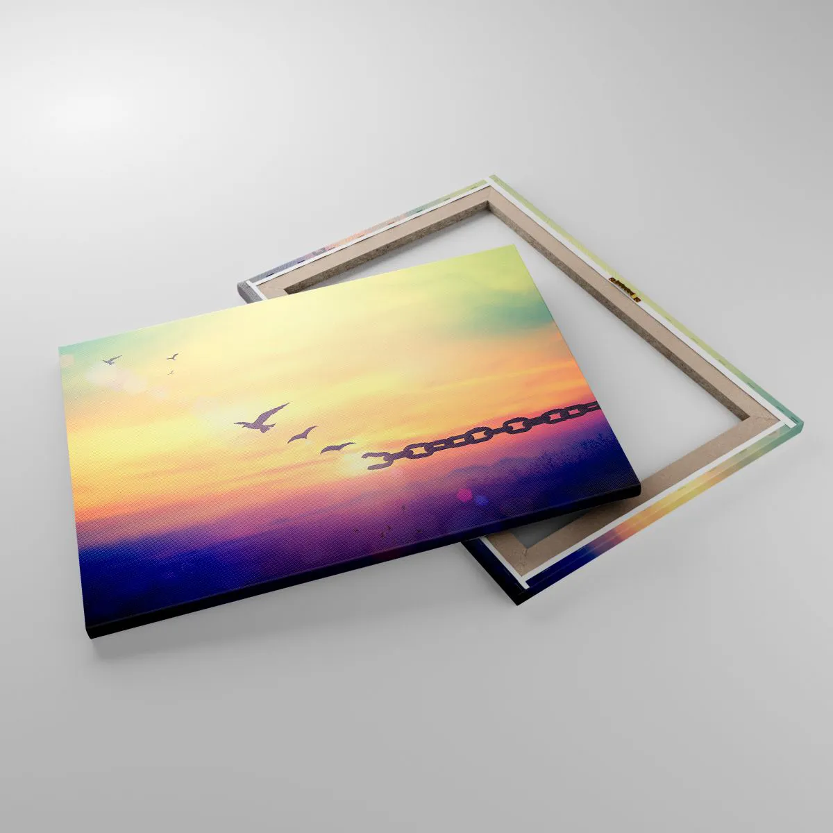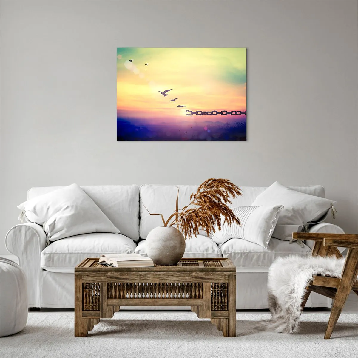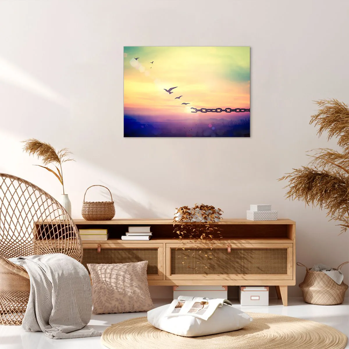 • Esta pintura inspiradora retrata uma corrente quebrada e pássaros voando em direção à liberdade em um pôr do sol em tons pastéis. Uma decoração perfeita, carrega simbolismo de esperança, liberdade e motivação.