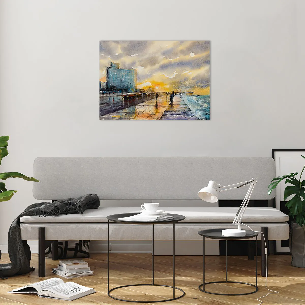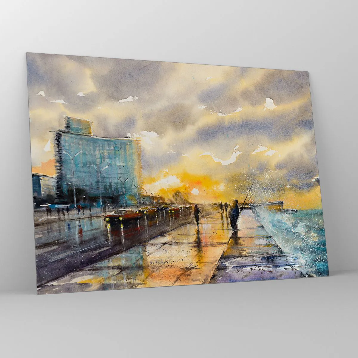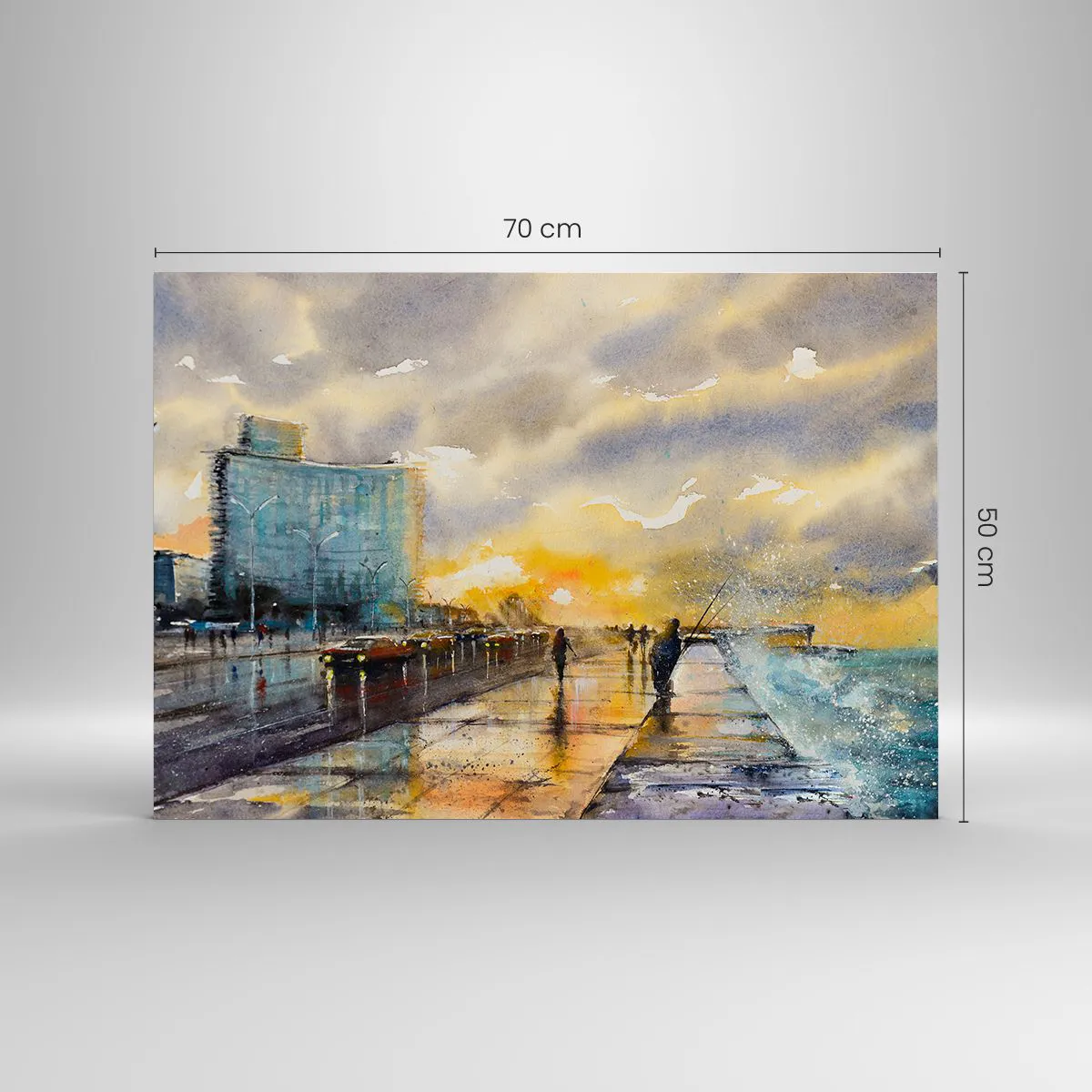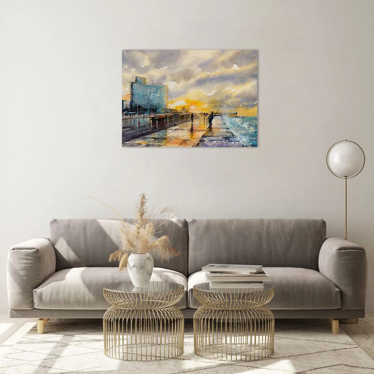 Quadro em vidro - Cidade litorânea em aquarela com pôr do sol - 70x50cm - A vida na costa - Decoração de parede moderna para a sala de estar e quarto ARTTOR