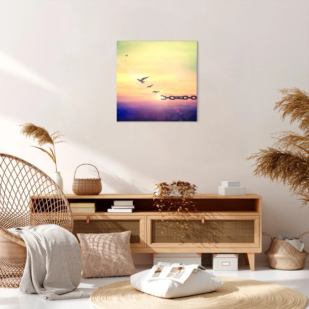 A tela é esticada na moldura. Os lados e bordas são impressos para criar uma continuação da imagem. O quadro está pronto para ser pendurado na parede. Cada produto tem um gancho ligado à moldura e um conjunto de montagem (parafuso + cavilha).