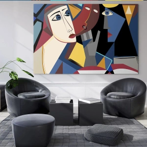 Quadro em vidro - Rostos cubistas em cores intensas - 70x50cm - Uma conversa entre cubistas - Decoração de parede moderna para a sala de estar e quarto ARTTOR
