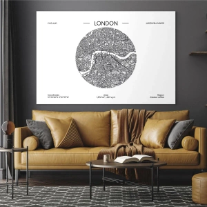 Quadro em vidro - Um mapa detalhado de Londres em estilo gráfico preto e branco. - 70x50cm - Anatomia de Londres - Decoração de parede moderna para a sala de estar e quarto ARTTOR