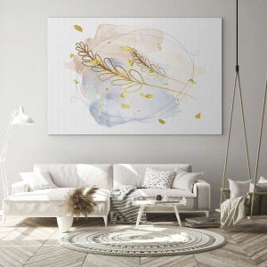 - Uma composição artística de galhos e folhas douradas sobre um fundo de aquarela em tons pastel. Uma decoração única e leve, com caráter sutil e formato moderno.
