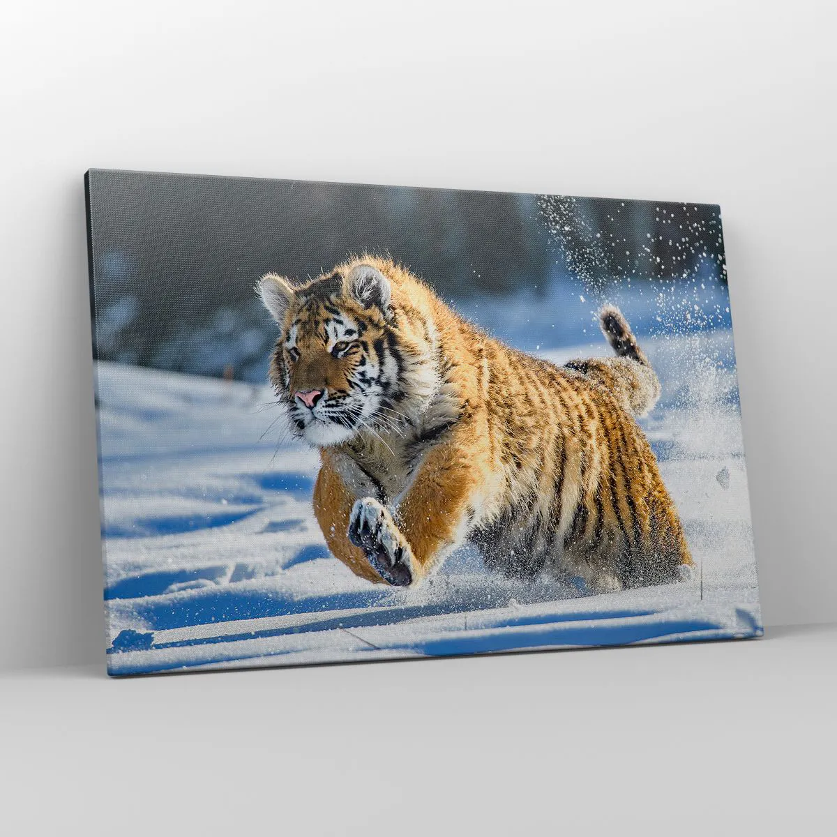 A tela é esticada na moldura. Os lados e bordas são impressos para criar uma continuação da imagem. O quadro está pronto para ser pendurado na parede. Cada produto tem um gancho ligado à moldura e um conjunto de montagem (parafuso + cavilha).