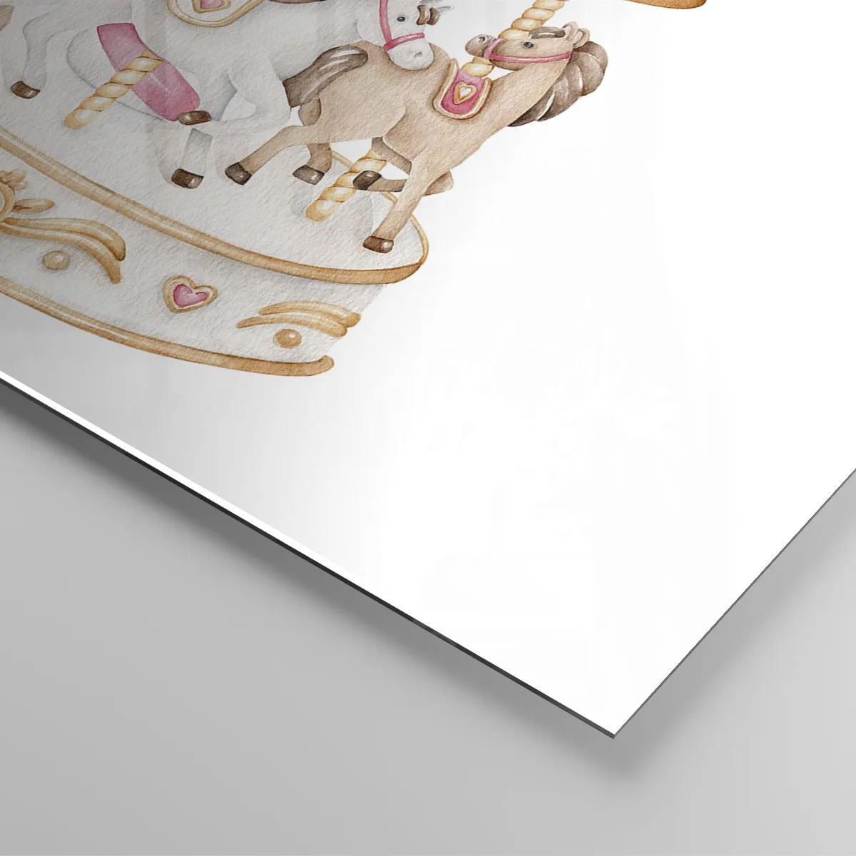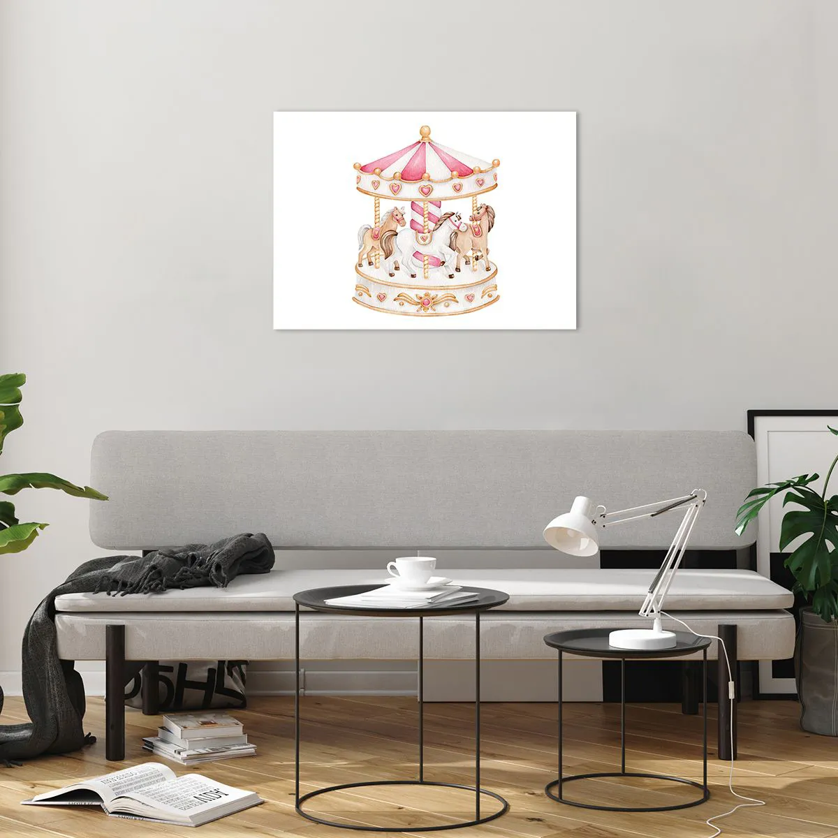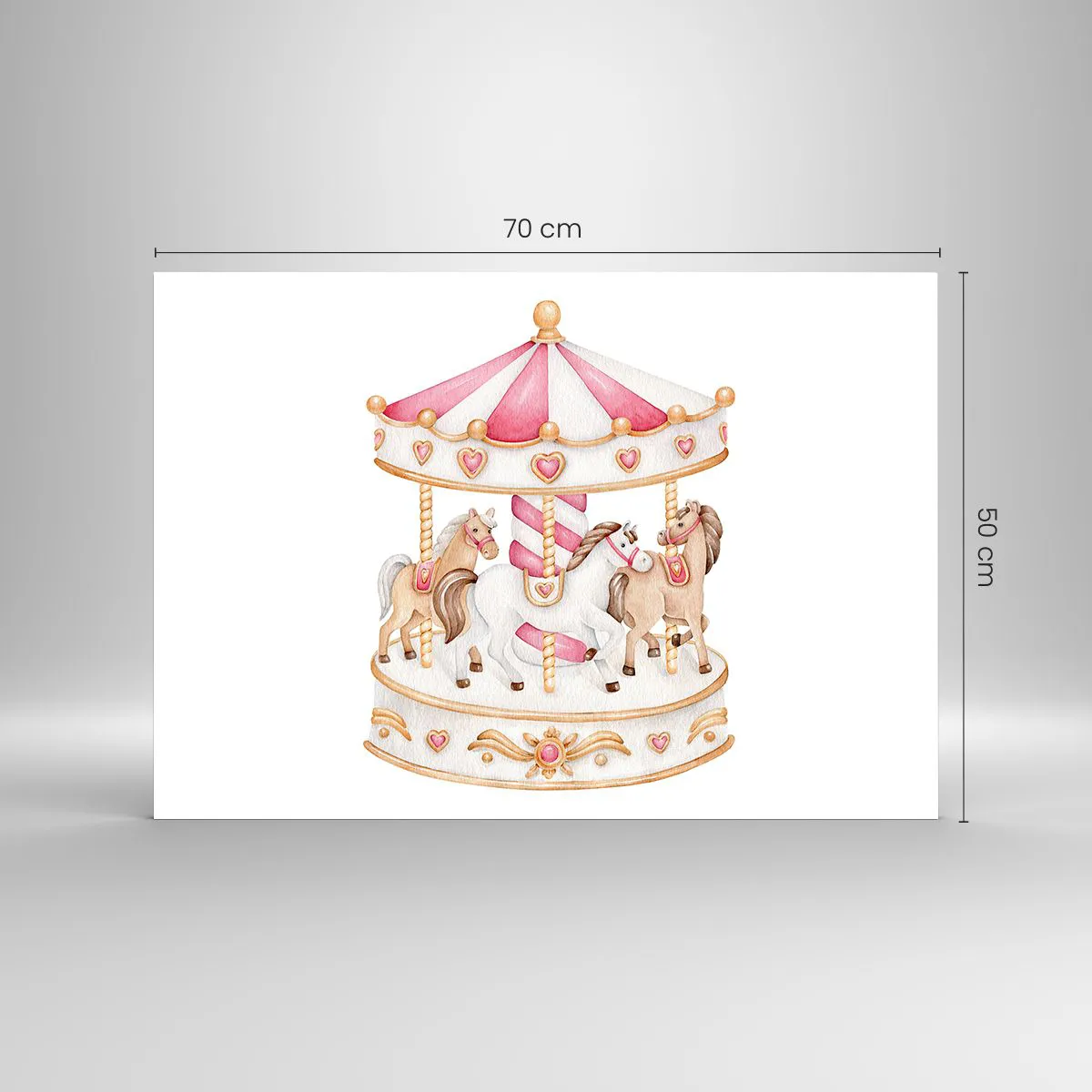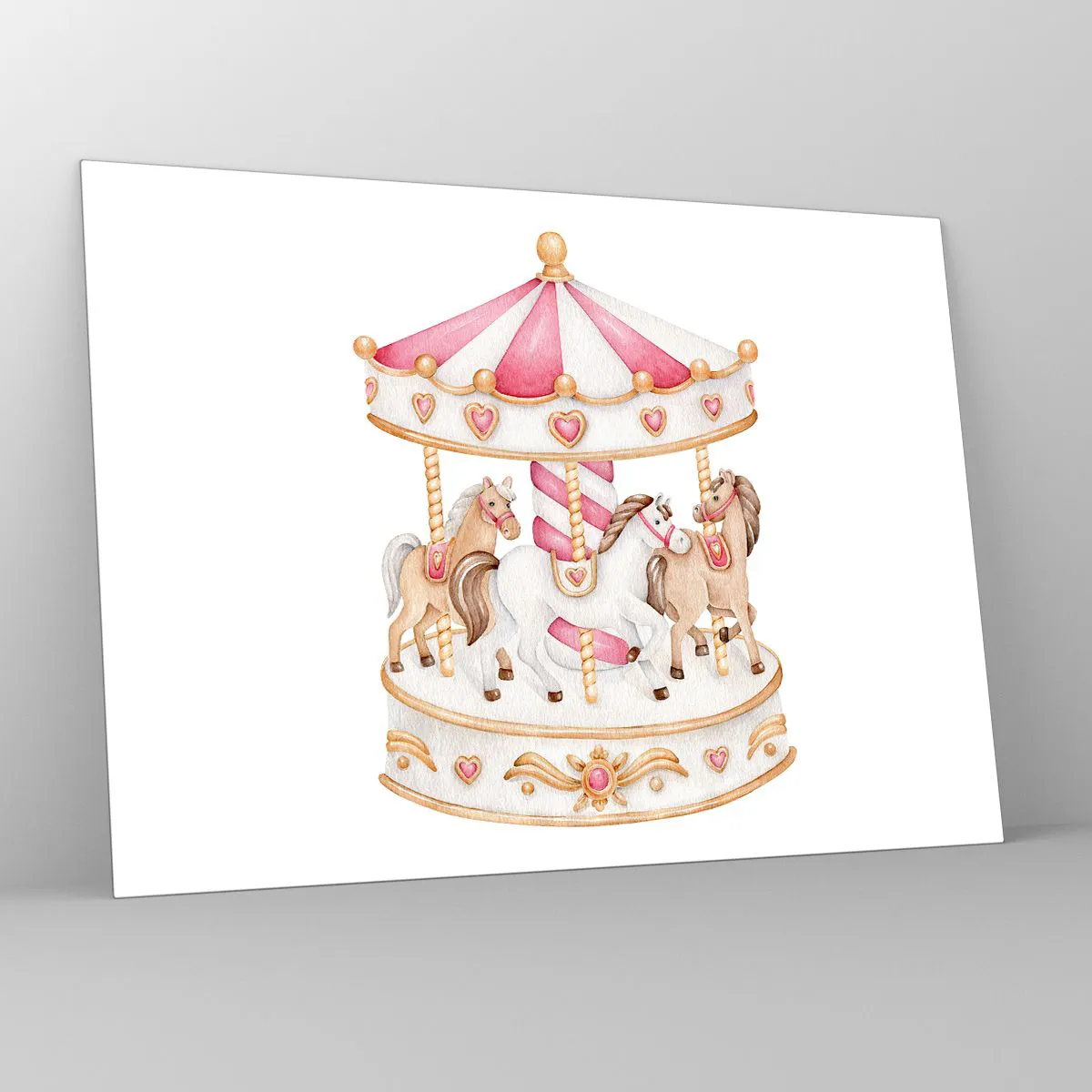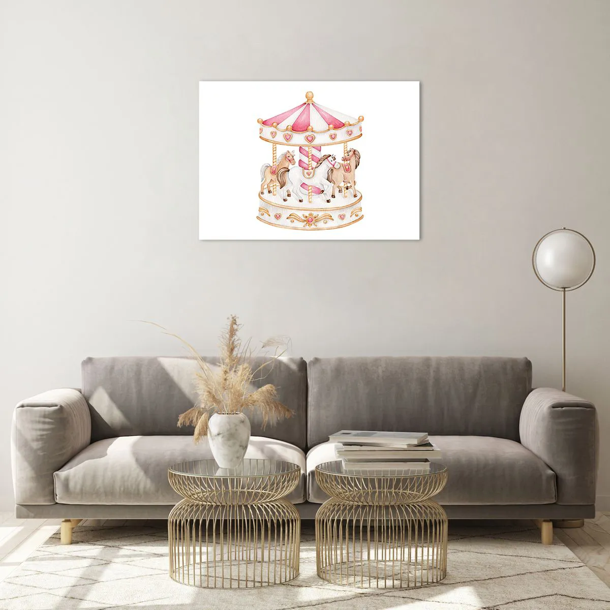 Quadro em vidro - Um carrossel rosa com cavalos de estilo infantil em um fundo branco - 70x50cm - O doce mundo da infância - Decoração de parede moderna para a sala de estar e quarto ARTTOR