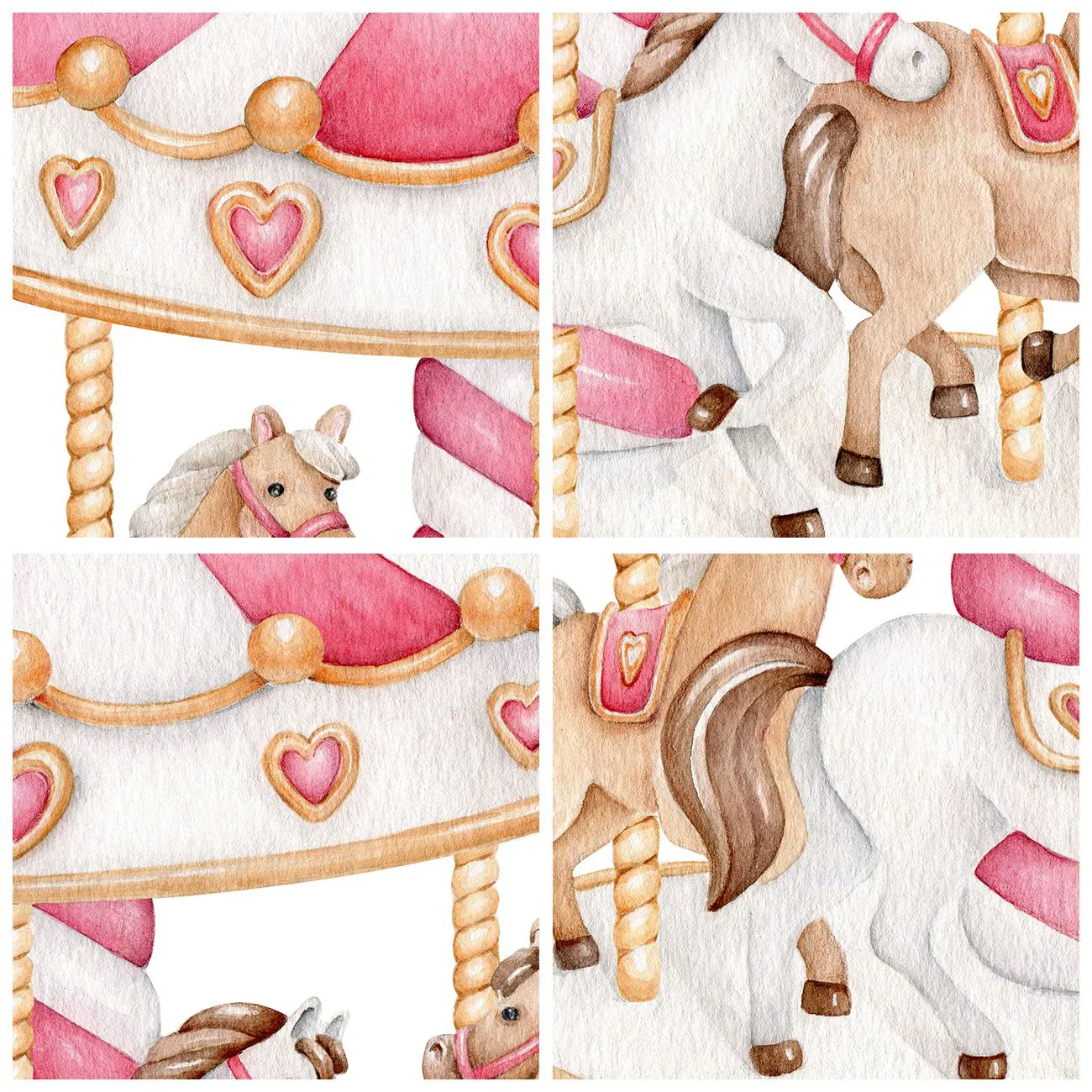 - Uma encantadora ilustração de um carrossel rosa com cavalos de contos de fadas, sobre um fundo branco. Perfeita para o quarto de uma criança, esta pintura traz alegria, leveza e imaginação colorida ao espaço infantil.
