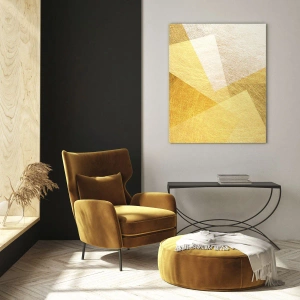 A pintura é dominada por retângulos e losangos sobrepostos, compostos por camadas com diferentes graus de transparência e intensidade de cor. A combinação de cores claras e douradas cria um arranjo harmonioso que atrai o olhar e adiciona profundidade à composição. A textura visível assemelha-se a metal escovado ou tela dourada brilhante, realçando a impressão de tridimensionalidade e a nobreza da forma. Cada fragmento dessa estrutura parece ter sua própria luz, permitindo que a imagem mude dependendo do ângulo de luz – garantindo que a decoração nunca permaneça estática, mas sim viva em harmonia com o ambiente.