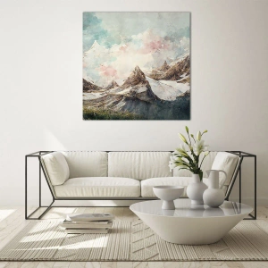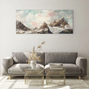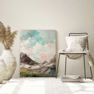 • A pintura retrata picos majestosos de montanhas banhados por um céu em tons pastéis. A sutil interação de cores e detalhes cria um cenário singularmente pitoresco e relaxante.